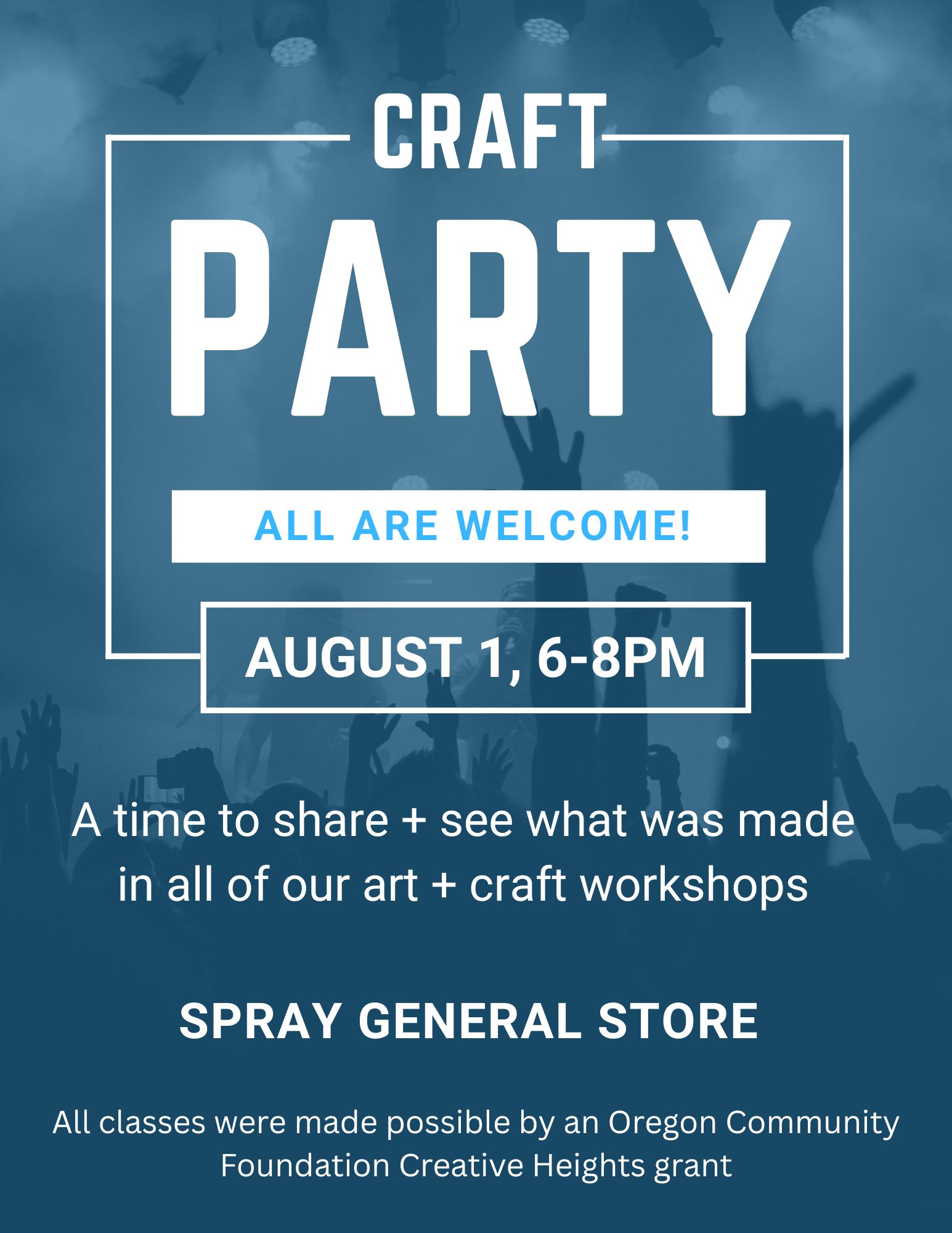 Come on over to the General Store to celebrate two years of art and craft making thanks to the Oregon Community Foundation Creative Heights grant. If you were a participant in any of the classes, bring your creations. If you did not attend a class, bring your curiosity and enthusiasm for seeing what was made when 21 artists came to town. If you are one of the instructors, we appreciate you beyond words and your presence is welcomed and still felt long after your class ended. Light appetizers will be served as well as a big dollop of camaraderie.